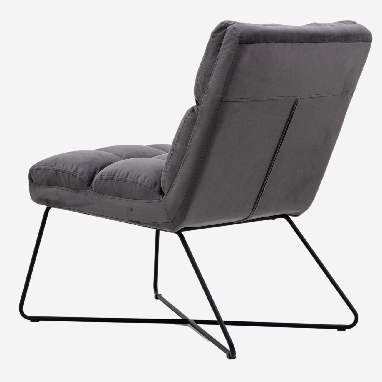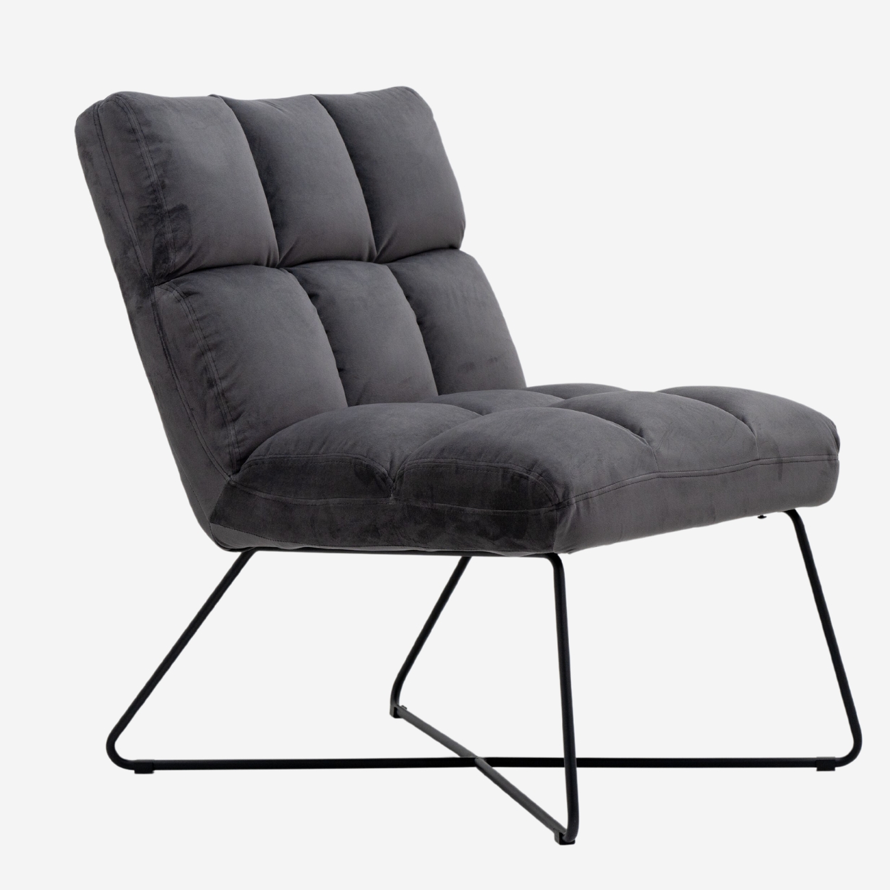 The Alba chair has a striking, modernist silhouette that doesn’t compromise comfort. Unique criss-crossed stainless steel base, the armless chair curves into an upholstered stunning velvet. Designed Exclusively for Crate & Crafts.