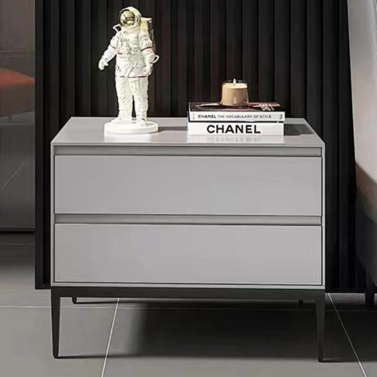 Compact and contemporary, the bedside tables feature a matte grey veneer with black accents and raised bases. Their clean lines and versatile design complete the collection with balance and practicality.